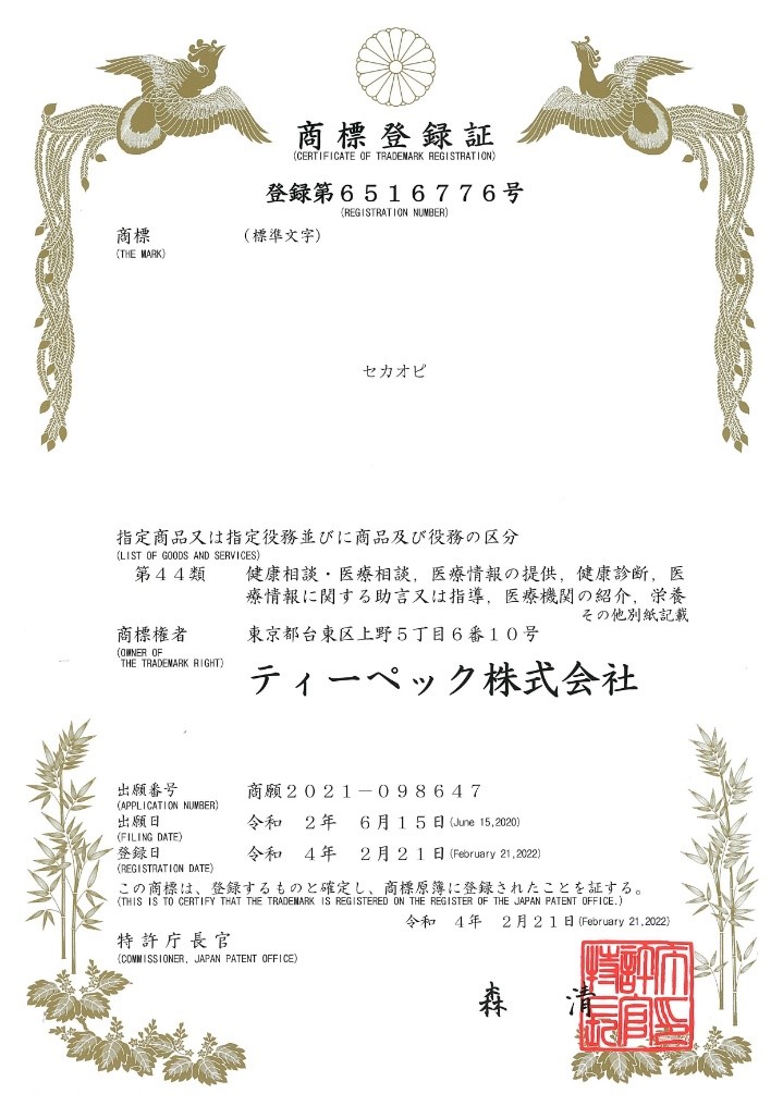 セカンドオピニオン手配サービス、24時間健康相談等の健康支援サービスを提供するティーペック株式会社(本社:東京都台東区、代表取締役社長:鼠家 和彦)は病気の診断や治療選択について主治医とは別の医師に求めるセカンドオピニオンの愛称「セカオピ」を特許庁に出願し、商標登録が完了しましたことをお知らせいたします。