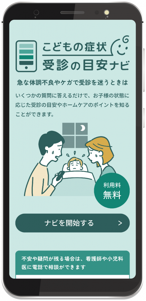 こどもの症状に応じた受診の目安を案内する「受診の目安ナビ」について、詳細はこちらから。